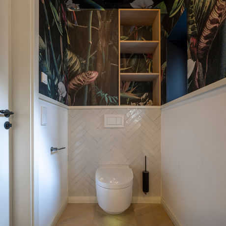Das Haus verfügt nun über zwei separate Eingänge: einen für die Erdgeschosswohnung und einen für die Wohnung im Obergeschoss. Ein neu errichteter Anbau im Erdgeschoss schafft zusätzlichen Wohnraum und beherbergt eine offene Galerie, die für großzügige Raumwirkung sorgt. Um die Barrierefreiheit sicherzustellen, wurde für die Obergeschosswohnung ein Aufzug installiert.