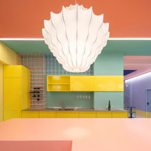 Anton Schmaus hat ein Faible für deutschen Wein und will diesen seinen Gästen auf spezielle Weise nahebringen: Sie sollen sich im ‚Tipsy‘ fühlen wie bei Freunden in der Küche. Deshalb bekam die Küchenzeile im neuen Store den Paradeplatz: Der schwefelgelbe Solitär wird von bunt lackierten Weinregalen aus Baustahlgittern umrahmt. Davor thront in Lachsrosa ein überdimensionaler und multifunktionaler Tresen. Zwei Kronleuchter hauchen ihr wattewolkiges Licht auf die Szenerie. Zart und frech stemmen sie sich gegen die ambitionierten monochromen Farbflächen: die Fenstersitzbank in Ultramarinblau, die Nischenecke in Koralle, die Wandsitzbank in Türkis und Gelb. Decken- und Wandflächen sind entsprechend vielfältig koloriert.